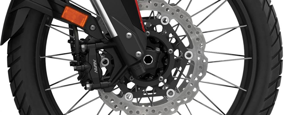 Los discos delanteros de 310mm de diámetro, accionados por pinzas Nissin de 4 pistones, sumados al disco trasero de 256mm de diámetro y la función de ABS en curvas, garantizan la máxima eficiencia y seguridad en el frenado.
