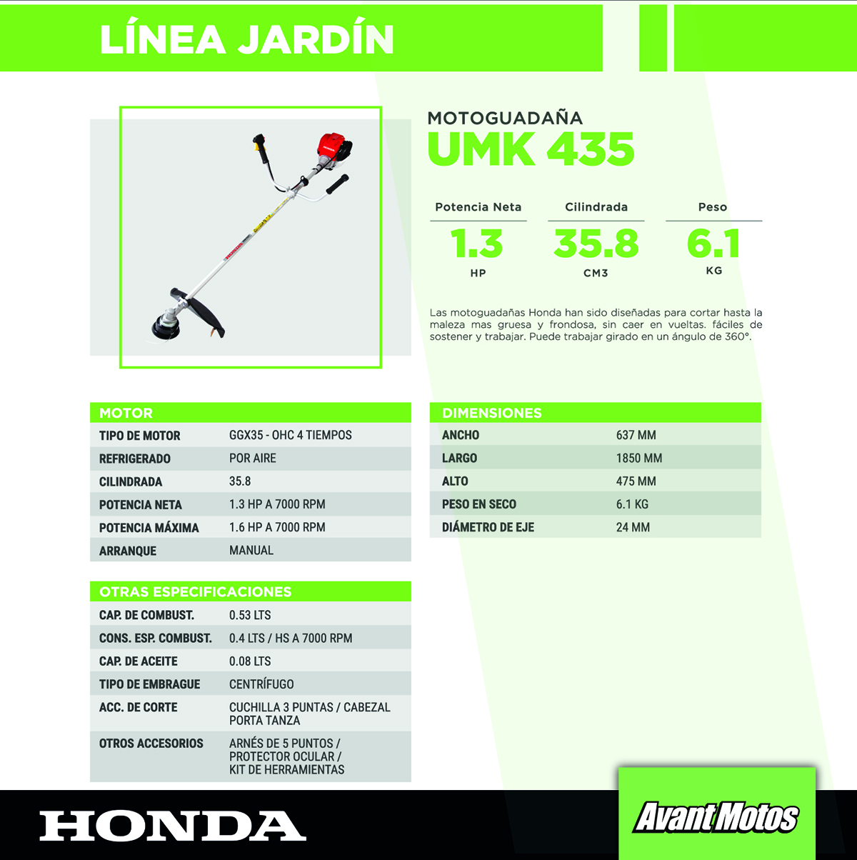 Las motoguadañas Honda han sido diseñadas para cortar hasta la maleza mas gruesa y frondosa, sin caer en vueltas. Su excelente balanceo y bajo nivel de ruido hacen que sean fáciles de sostener y trabajar. Gracias a su motor de 4 tiempos, el equipo puede trabajar girado en un ángulo de 360º sin que se produzcan fallas por falta de lubricación.